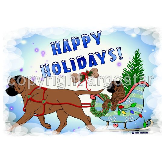Bullmastiff happy holidays Christmas cards.  Everything that you need for Christmas is in this sleigh.