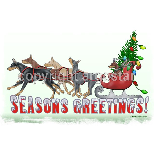 Doberman Pinscher seasons greeting Christmas sleigh Christmas cards. Choice of north or south theme.