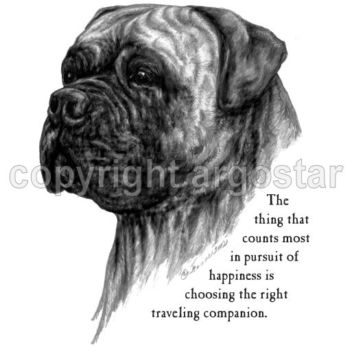 Bullmastiff head study note cards, "The thing that counts most in pursuit of happiness is choosing the right traveling companion."