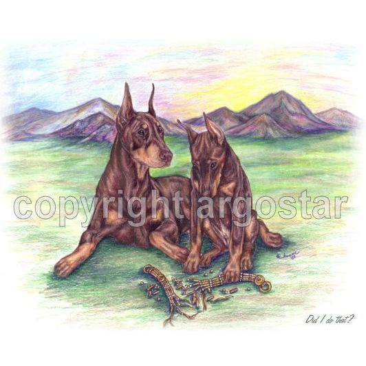 Doberman Pinscher red puppy collar chewing note cards, "Did I do that?"